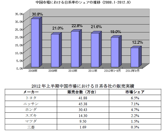 2005~2007年の間、日系車は中国市場で一時30%を超えるシェアを誇り、2007年には欧米車をおさえ中国におけるトップシェアを獲得したが、その後、徐々にシェアを落とし、2012年度、ネガティブ報道の増加につれて販売量が減少し始め、特に「島購入事件」以来、日系車のシェアが急激に下落した。