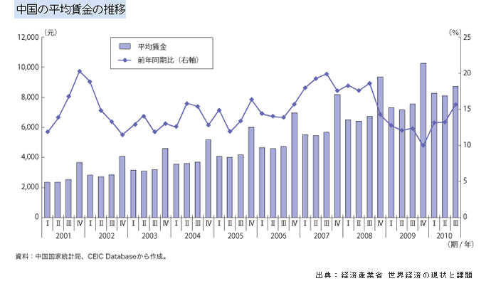 以下は中国の平均賃金の推移を示すグラフであるが、2000年半ば以降、労働市場の逼迫と政府の所得拡大志向が相まって2001年から2010年にかけての平均賃金上昇率は15%弱となっており、急激な上昇となっている事が分かる。
